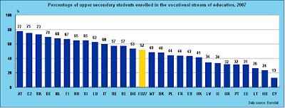 No gráfico abaixo temos, em percentagem, o número de estudantes de nível secundário inscritos em educação e formação profissional relativamente ao total de alunos no ensino secundário. Os dados incluem todos os 27 Estados Membros da UE e referem-se a 2007.