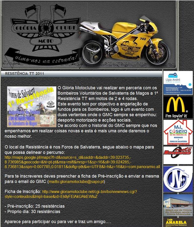 Vai ter lugar no próximo domingo, dia 20 de Março, nos Foros de Salvaterra, uma prova de Resistência TT para motos de 2 e 4 rodas. A organização do Glória Moto Clube (GMC) vai ser feita em parceria com os Bombeiros Voluntários de Salvaterra de Magos uma vez que se pretende cumulativamente angariar verbas para aquela Associação Humanitária. No endereço electrónico acima poderá ter acesso ao mapa com o traçado da prova e à ficha de inscrição. Divirta-se e ajude.