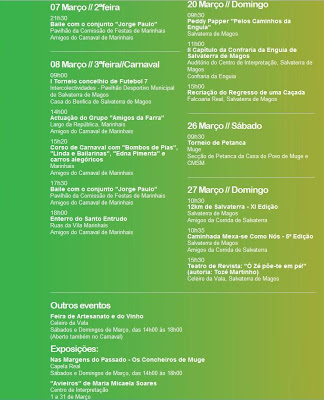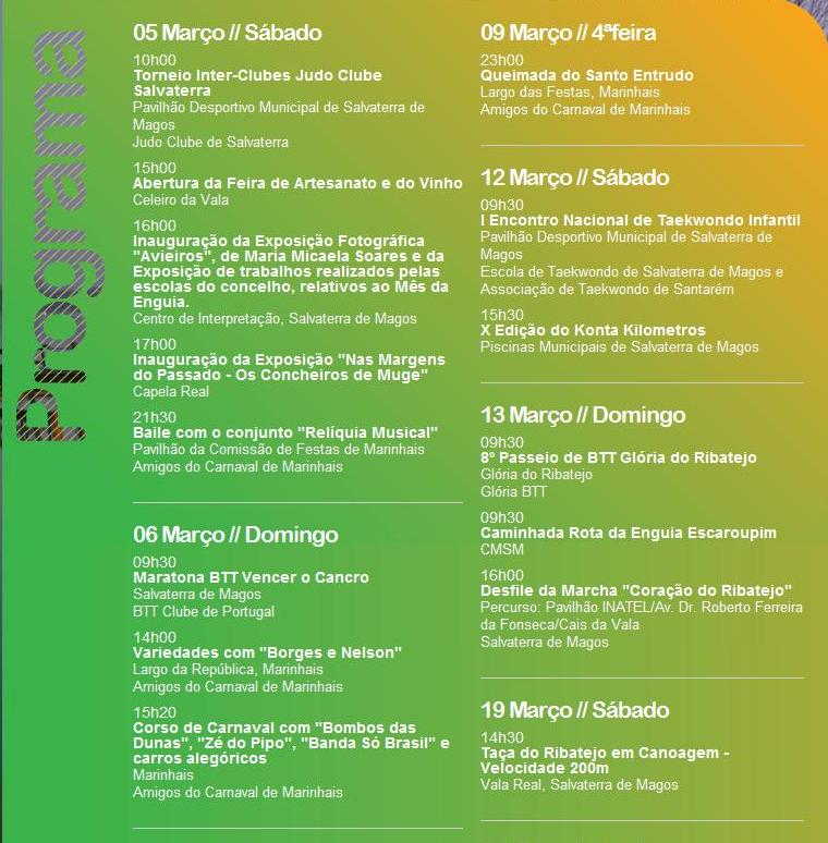 Em complemento do post que publicámos em 26-2-2011, sobre a edição deste ano do Mês da Enguia, onde dávamos pública nota dos restaurantes aderentes a este evento gastronómico e cultural que, de 1 a 31 de Março, vai animar o nosso concelho de Salvaterra de Magos, reproduzimos seguidamente o respectivo Programa: