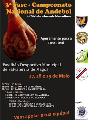 Esta 3ª fase vai realizar-se em Salvaterra de Magos - hoje, amanhã e domingo - uma vez que a opção foi as equipas das ilhas virem ao continente e, entre o CAS e o Tarouca, o CAS foi o que conseguiu mais pontos. Vejam a este propósito o que vem no site da Câmara Municipal de Salvaterra de Magos.