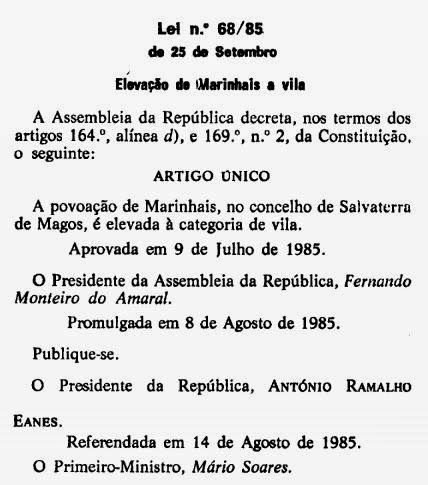 A vila de Marinhais faz hoje o seu 29º aniversário, pois data de 9 de Julho de 1985 a aprovação pela Assembleia da República da elevação da povoação de Marinhais à categoria de vila.